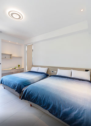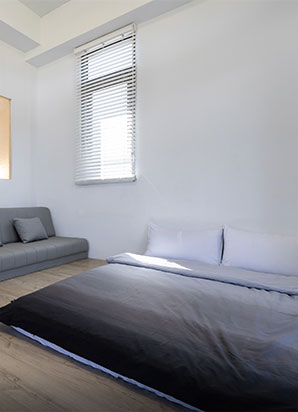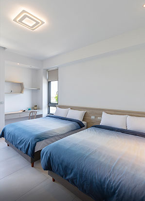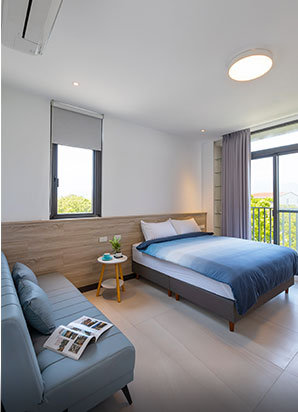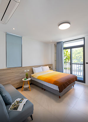 房間設計延續了簡約與自然的調性,提供二人、四人房型選擇。每間房型皆設有陽台,旅人可享受綠意與星空。