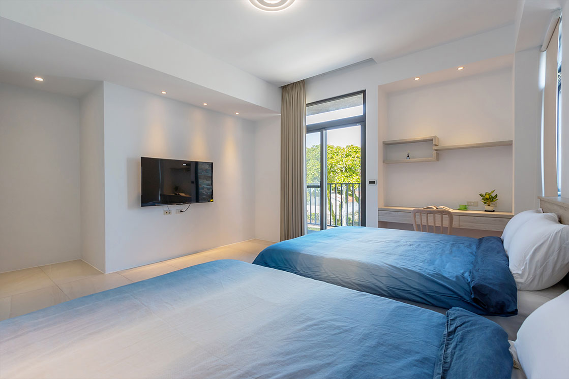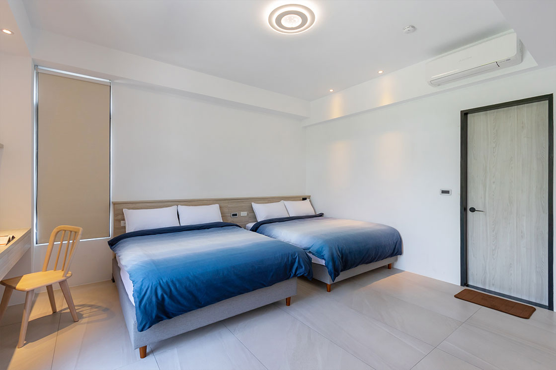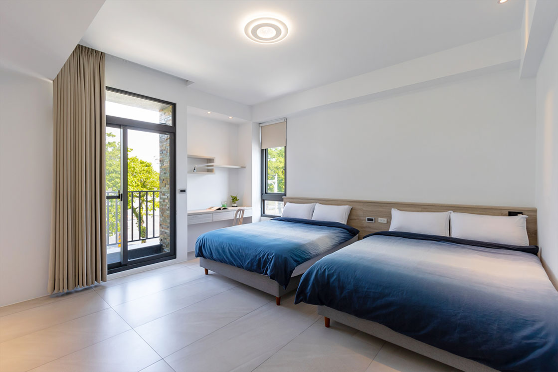 房間設計延續了簡約與自然的調性,提供二人、四人房型選擇。每間房型皆設有陽台,旅人可享受綠意與星空。