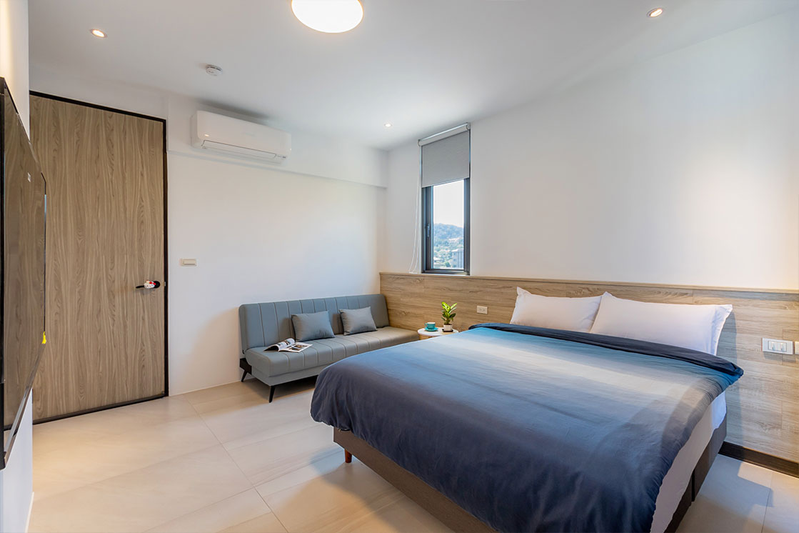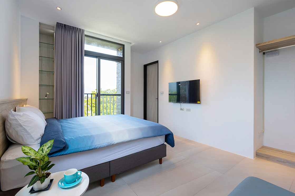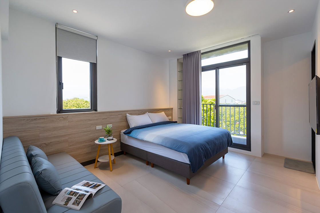 房間設計延續了簡約與自然的調性,提供二人、四人房型選擇。每間房型皆設有陽台,旅人可享受綠意與星空。